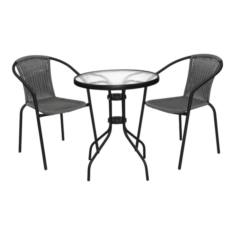 Upgrade your outdoor space with the SupaGarden Rattan Bistro Set in Grey/Black. This stylish and compact 3-piece set includes two comfortable chairs and a round table with a 5mm tempered glass top. The durable rattan weave is supported by a sturdy steel frame, making it ideal for patios, balconies, and small gardens.
